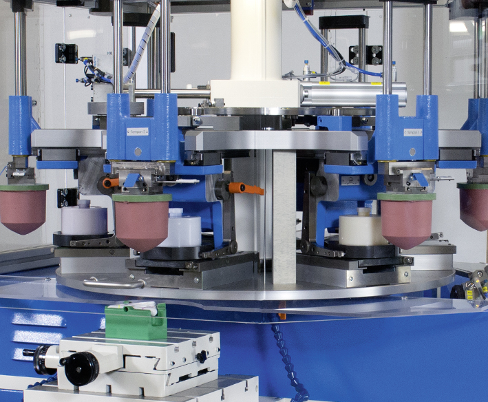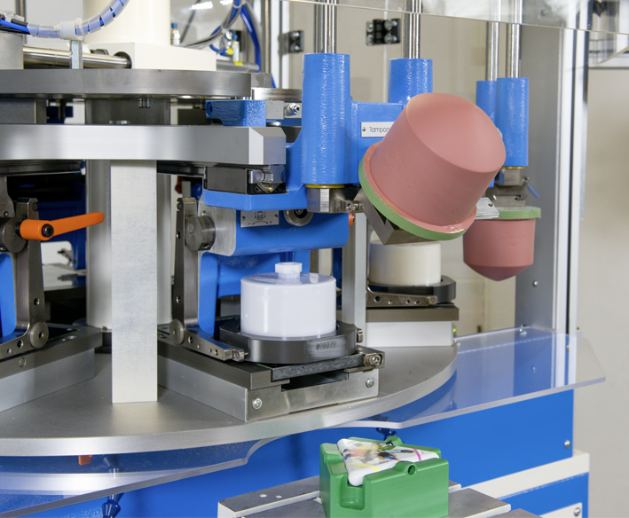 Kompakte 4 oder 6 Farben-Tampondruckmaschine mit nur einer Werkstückaufnahme. Separat einstellbare Farb-/Rakeltöpfe für garantiert optimalem Klischee-Anpreßdruck bei allen TAMPOPRINT®-Klischeetypen. Mittels SPS individuelle Programmierung von bis zu 5 Einstellungen.